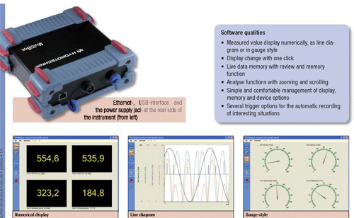 Connect sensors and the USB interface – ready. The intuitive software offers professional functions for the immediate monitoring and recordingof all channels. Select the version that fi ts best for you: USB measuring box,data logger or Ethernet measuring box.